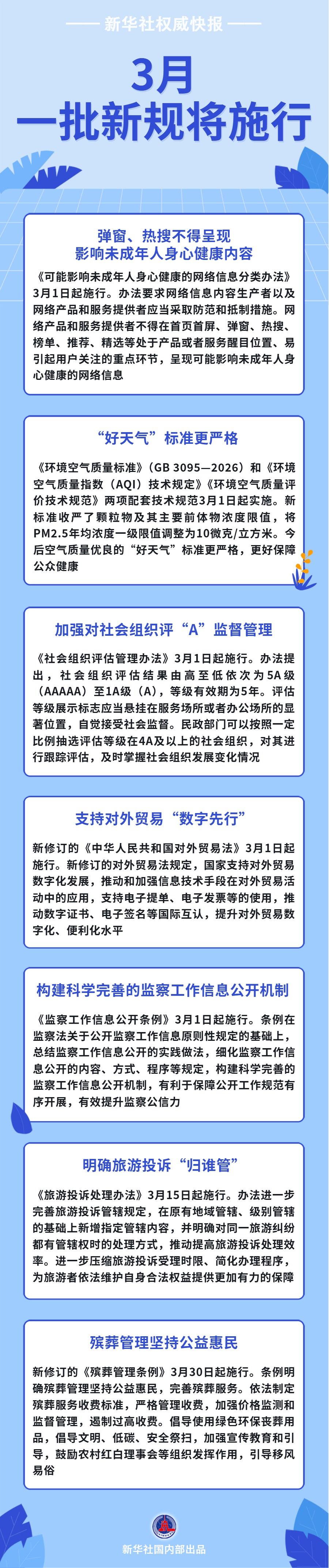 by: adminPosted on: 2026年2月27日 新规定将于3月份全面实施 可能影响未成年人身心健康的互联网信息不应出现在首页首屏、弹出式搜索中。为更好保障公众健康,“好天气”标准将更加严格。加强对A级社会组织的监督管理……新规3月起施行,一起来看看吧!记者:琪琪 海报制作:琪琪新华社制作