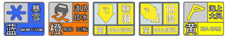 暴风雪蓝色预警、道路结冰橙色预警、寒潮黄色预警、低温黄色预警、大风黄色预警。